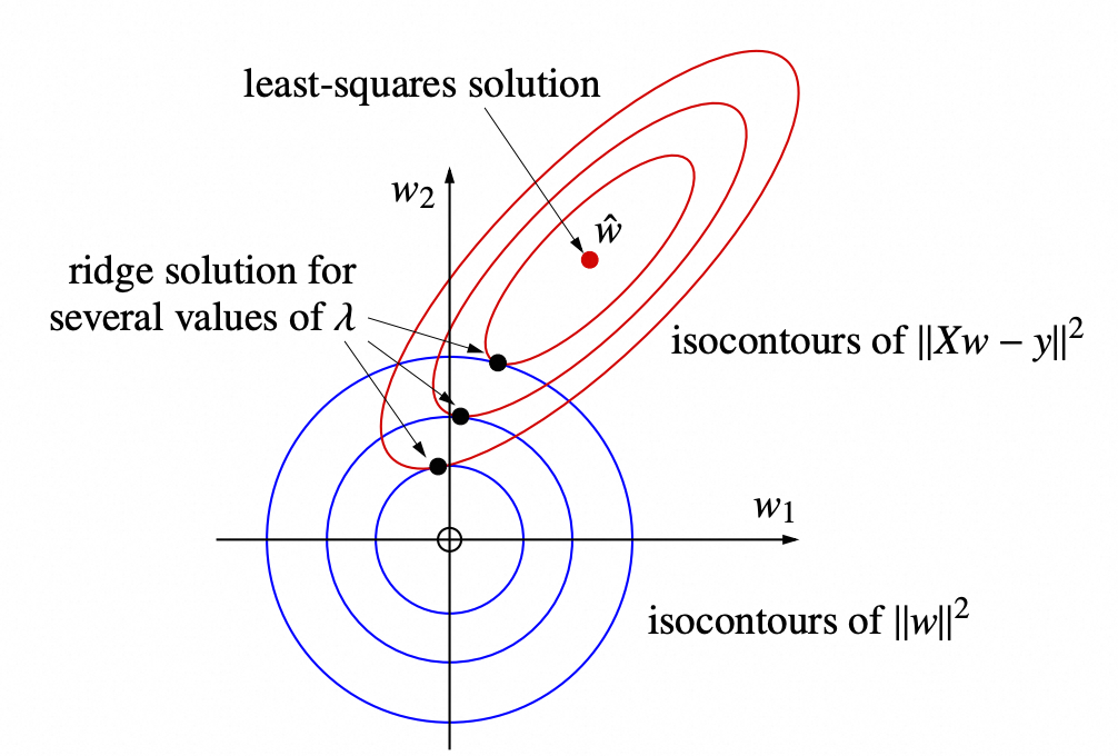 上图中红色的表示 $\|Xw - y\|^2$ 的等值线,蓝色的表示 $\|w\|$ 的等值线,红色等值线第一次和蓝色等值线相交的点就是岭回归的解