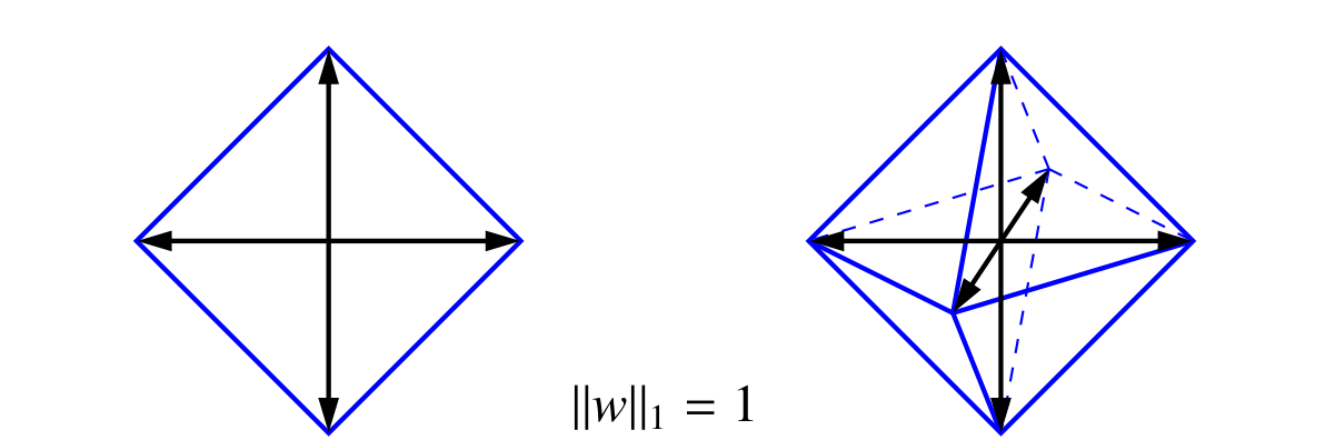 岭回归的正则项 $\|w'\|^2$ 是一个超球面,而 $\|w'\|_1$ 对应的是一个正多面体