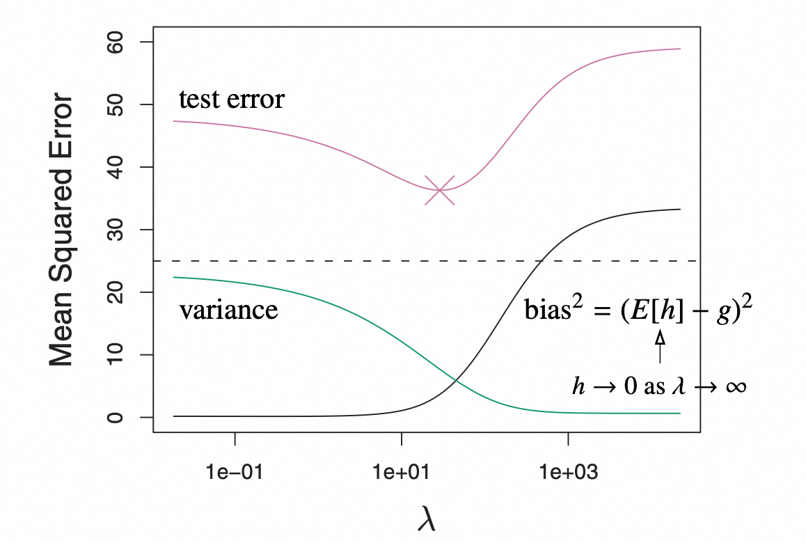 岭回归的方差为 $Var(z^T(X^TX + \lambda I')^{-1} X^T e)$,可以看出 $\lambda$ 增大时,方差减小,但是偏差会增大