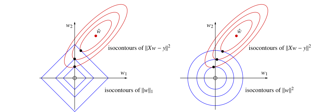 上图中,红色的椭圆形表示 $\|Xw - y\|^2$,其中最小二乘法的解为中心的红点。左边蓝色的四边形表示 $l_1$ 正则项,如果 $\lambda$ 较大,对应的四边形约小,两个图形的第一次相交于竖轴,此时特征 $w_1$ 对应的权重为 0,这种方法可以用于去除无用特征
