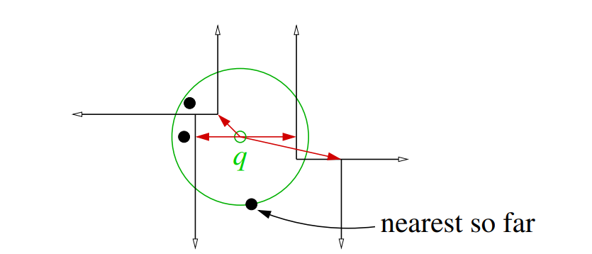 - 取出 $B$ 中的训练样本 v,如果 $\|q - v\| < r$,那么 $w \leftarrow v; r \leftarrow \|q - v\|$