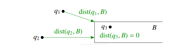 在搜索时,我们需要计算 $q$ 到区域 B 的最小距离 $dist(q, B) = \min_{z \in B} \|q - z\|$