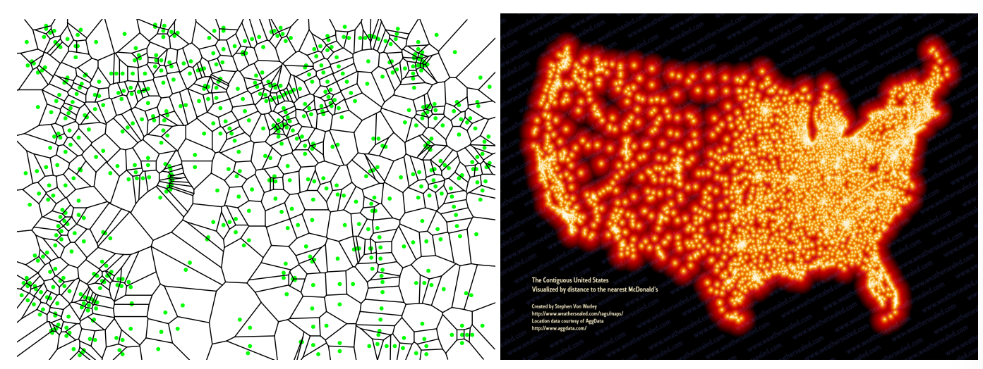 $$Vor(w) = \{ p \in \mathbb{R}^d : \|p - w\| \le \|p - v\|, \forall v \in X \}$$$X$ 中 所有的 Voronoi cell 就是 Voronoi diagram