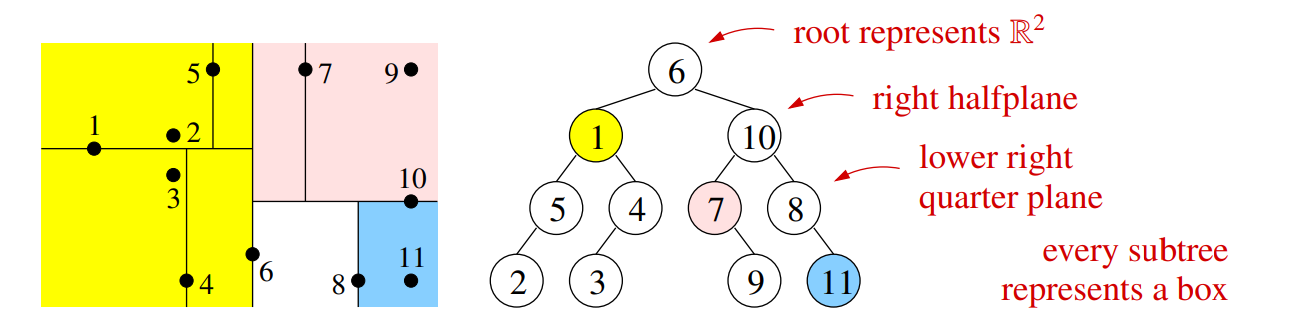- 选择特征的中位数或者中值作为划分边界。使用中位数可以保证树的深度为 $\log_2 n$,建树复杂度为 $O(nd \log n)$;如果使用中值可能导致树失衡